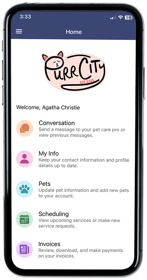 - Purr City will reach out via phone asap during office hours to set you up as a client in our booking app.